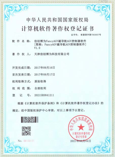 FancyAGV磁導航AGV控制器軟件著作權(quán)登記證書